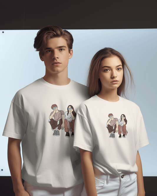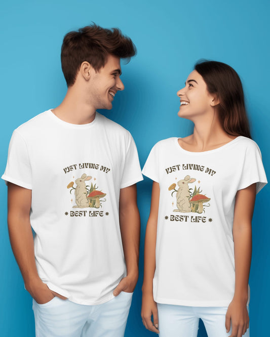 White Unisex short sleeve cotton bio wash T-Shirt with Mouse and Mushroom design